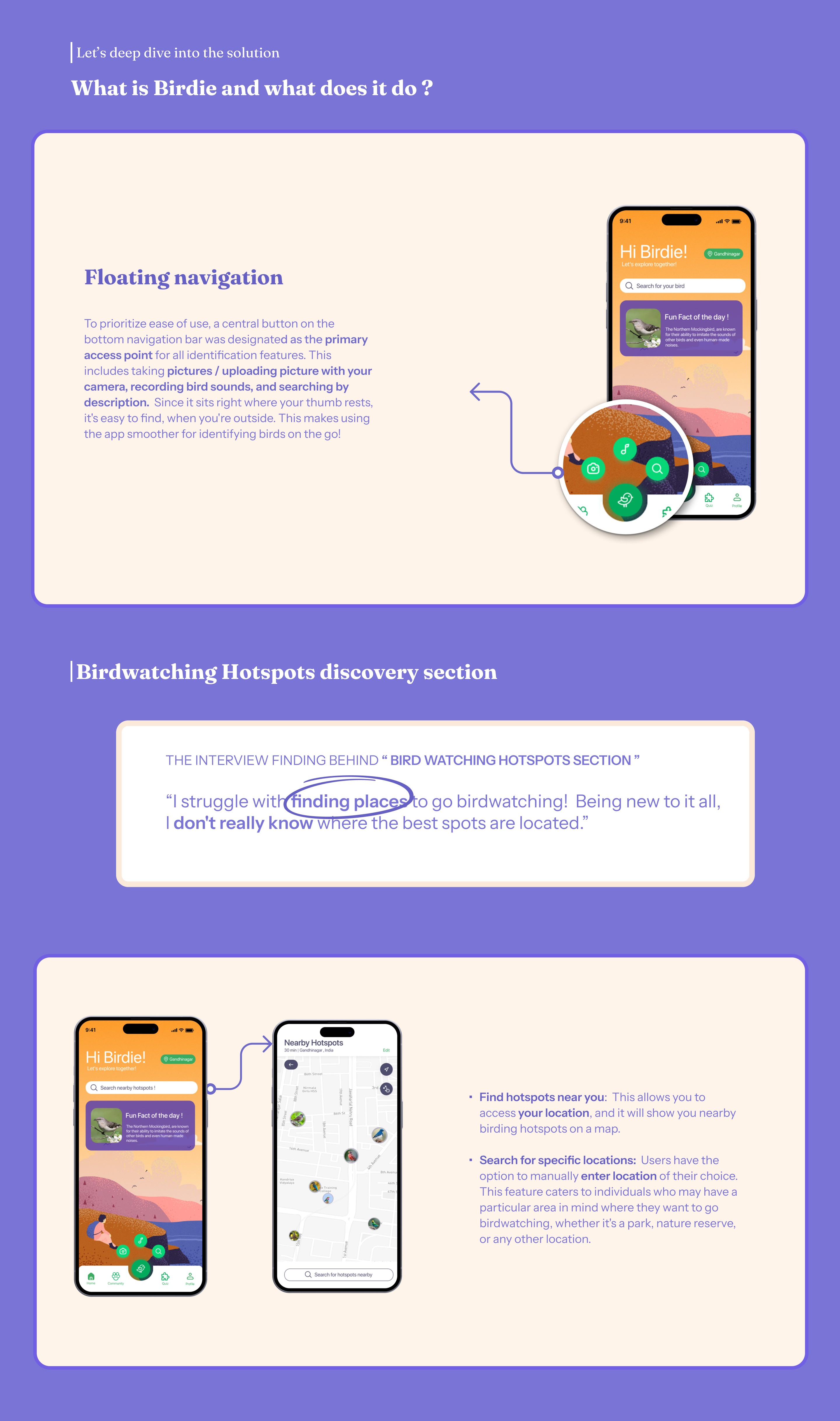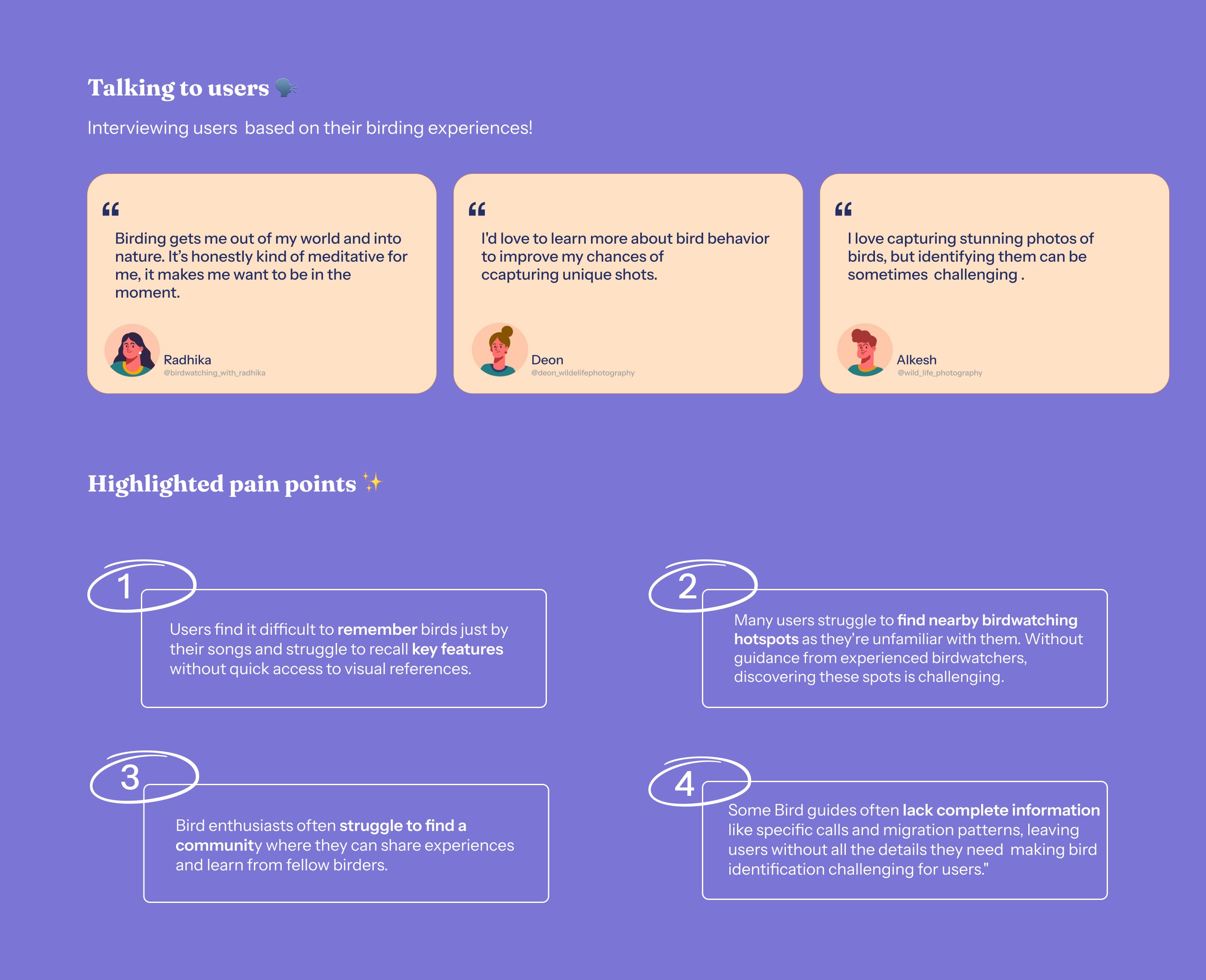 Birdwatching enthusiasts often face difficulties in accurately identifying birds and discovering optimal birdwatching locations, making it hard for them to know which birds they're seeing, resulting in missed opportunities to see the birds they want to watch.